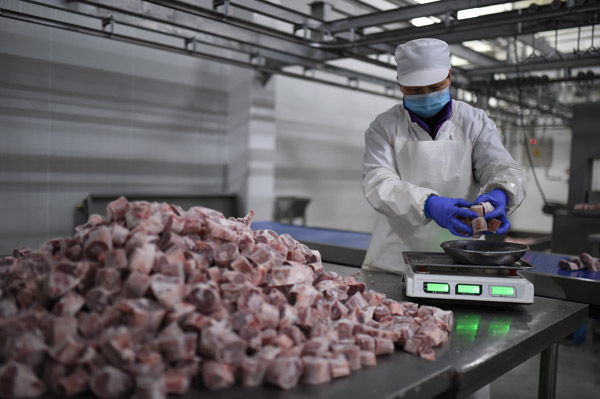 在宁夏盐池滩羊集团的高标准屠宰加工厂内,工人对分割后的滩羊肉进行分拣称重(11月2日摄)。新华社记者 戴天放 摄