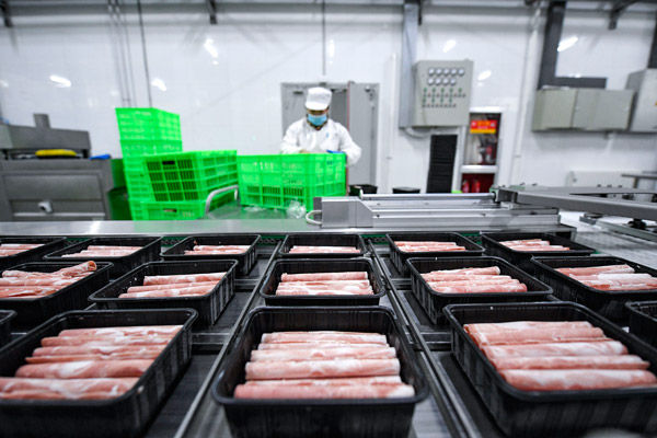 在宁夏盐池滩羊集团的高标准屠宰加工厂内,加工好的滩羊肉卷在生产线上进行包装(11月2日摄)。新华社记者 冯开华 摄