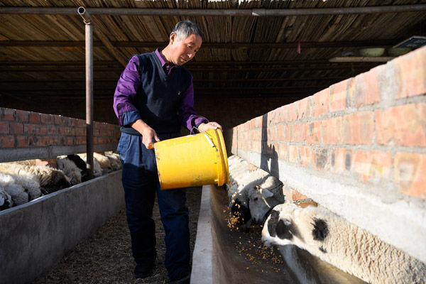 盐池县青山乡旺四滩村村民周永满在给自家养殖的滩羊添加饲料(11月2日摄)。新华社记者 冯开华 摄